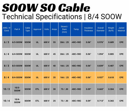 8/4 SOOW Cable Cord Wire - 8 Gauge 8 AWG 4 Conductor 600V Portable Power Extension Cord Cable with Ultra Flexible Insulation Jacket