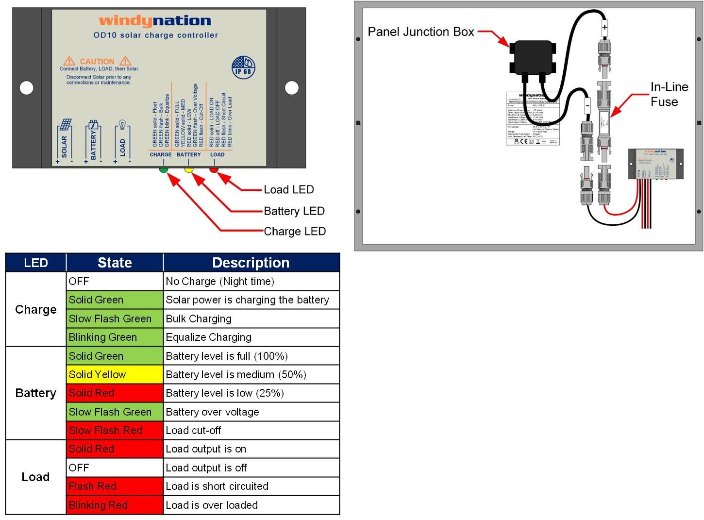 - Pre-wired for easy installation, including cables for attaching solar panel, battery, and load (optional)